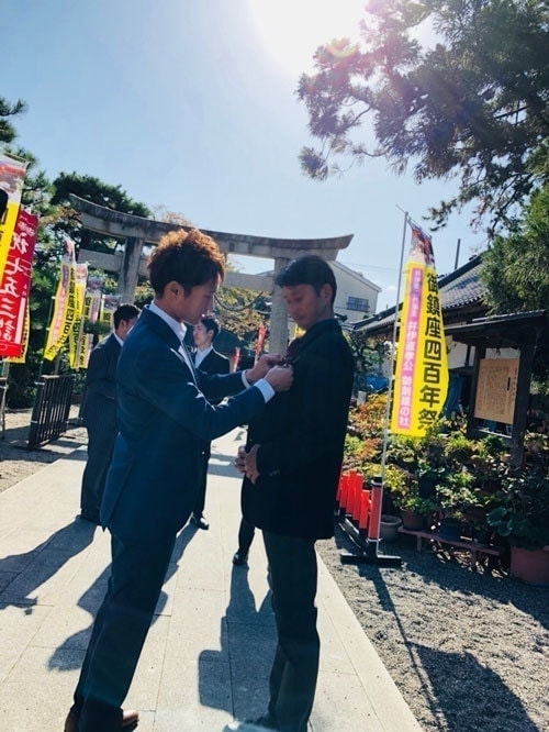 「元服の儀」として、赤備え集団代表より清められたネクタイを頂き、その場でネクタイを締め、大人としての一歩を踏み出しました。