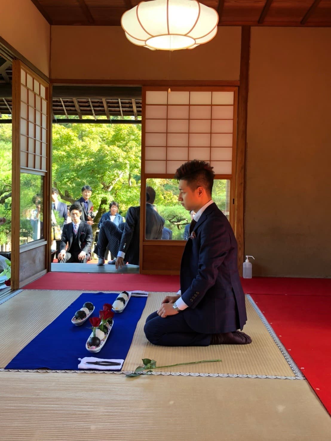 抹茶が初めての新成人、こんなに長く正座をしたのは初めてなど、いろんな気持ちがありました。 快晴の青、玄宮園の緑、赤い毛氈。贅沢なひと時を過ごしました。