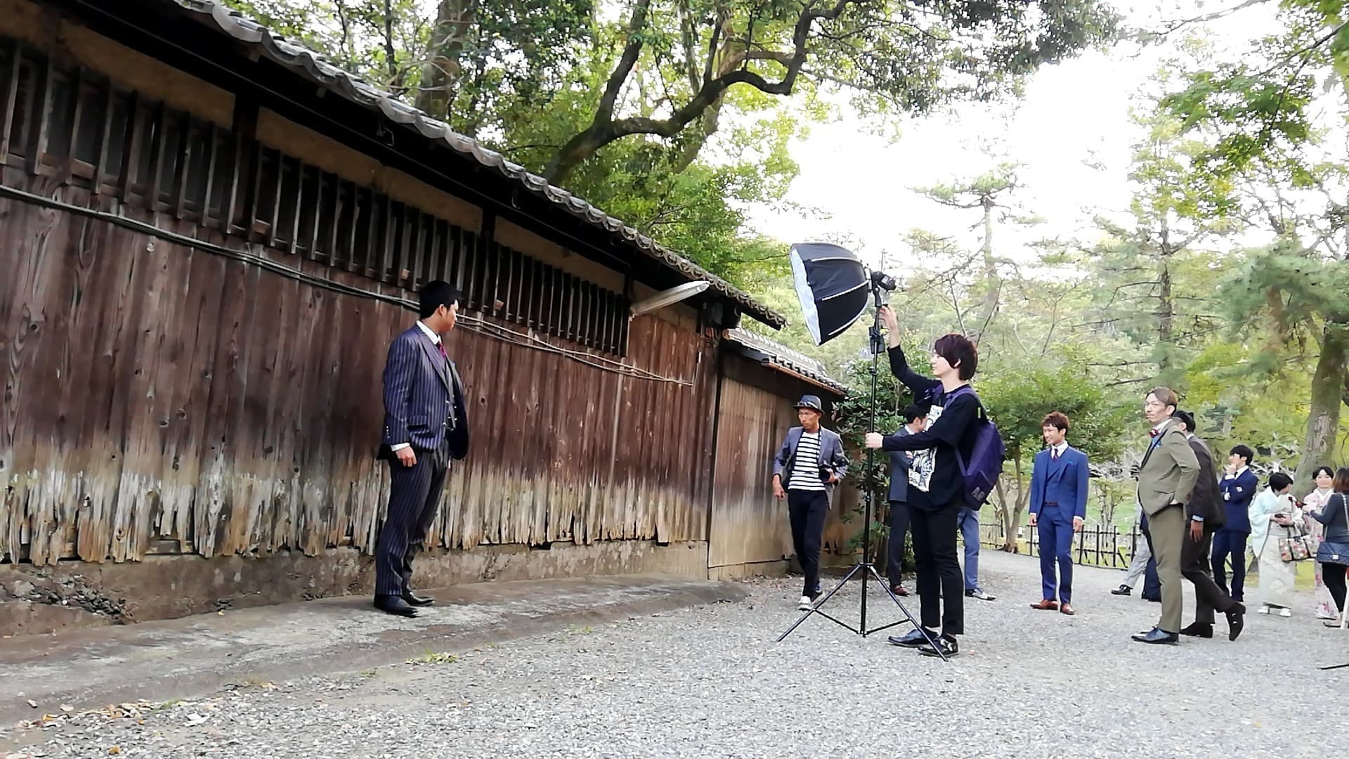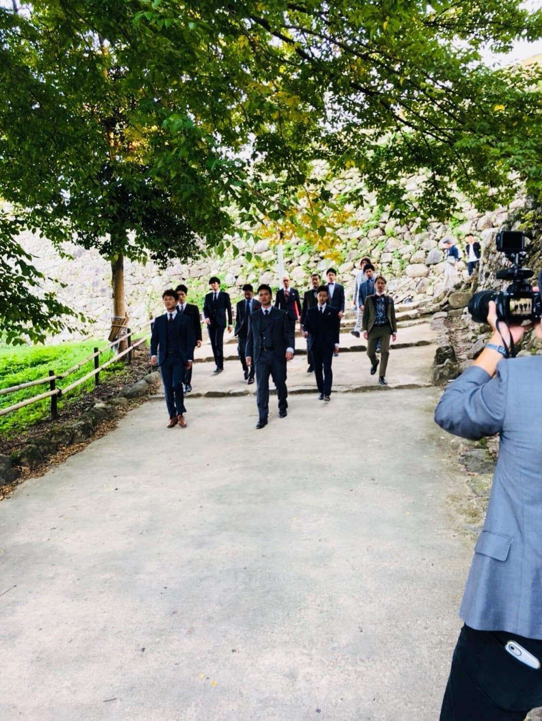 彦根城に皆で移動し、生垣や階段、天秤櫓などで、「カッコいい男のスーツ集団」いわゆる赤備え集団のポーズ撮影をしました。