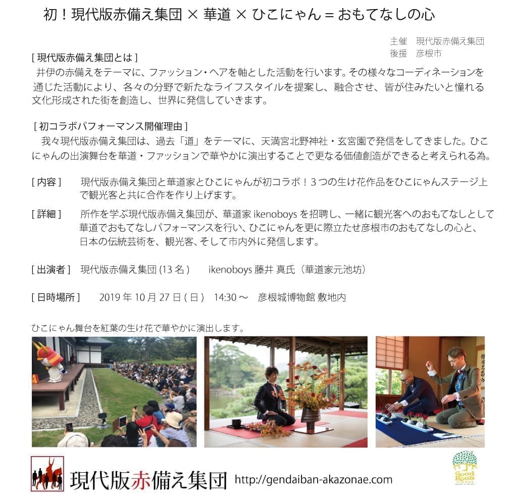2020現代版赤備え元服式~彦根城・華道パフォーマンス 華道パフォーマンス 開催場所 彦根城正面入り口向かい、彦根城博物館横「ひこにゃんブース」 開催時間 14:20 開門予定 14:30 現代版赤備え集団による、「華道パフォーマンス」 15:00 ひこにゃん登場、コラボイベント 是非お越しください。