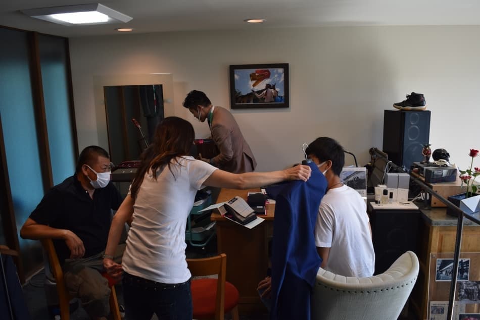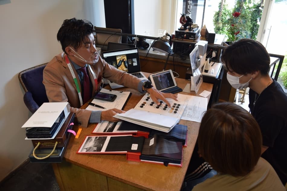 1000種類もある生地から事前に一人一人に合う生地を絞りこみ、今回の元服式の主役である20歳の若者に、一番似合う、色やデザインを提案します。
