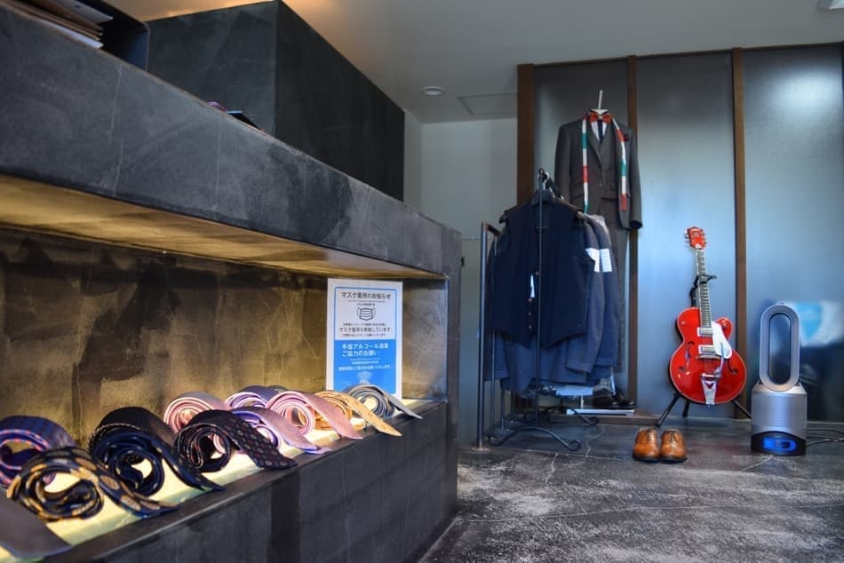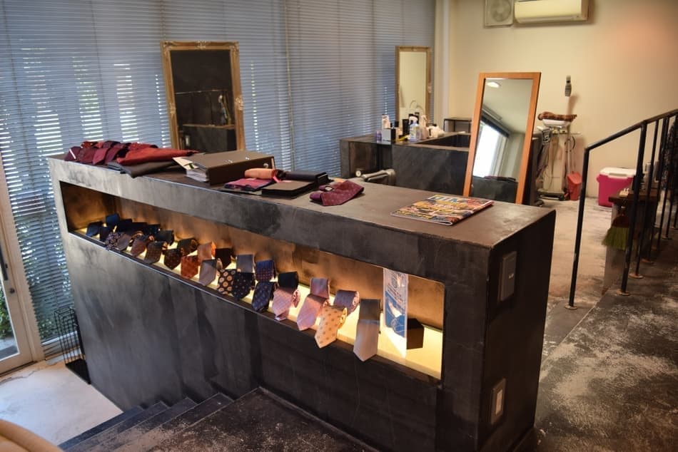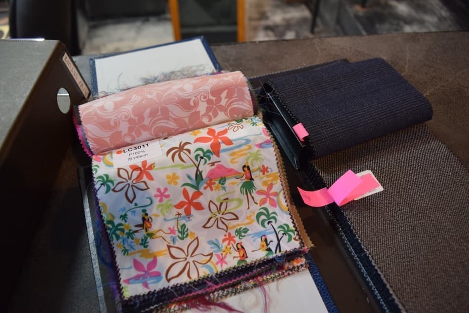 オーダースーツの生地や、カラフルなスーツ裏地のデザイン、スタイリストが特別にピックアップしたオーダーネクタイがディスプレイされています。