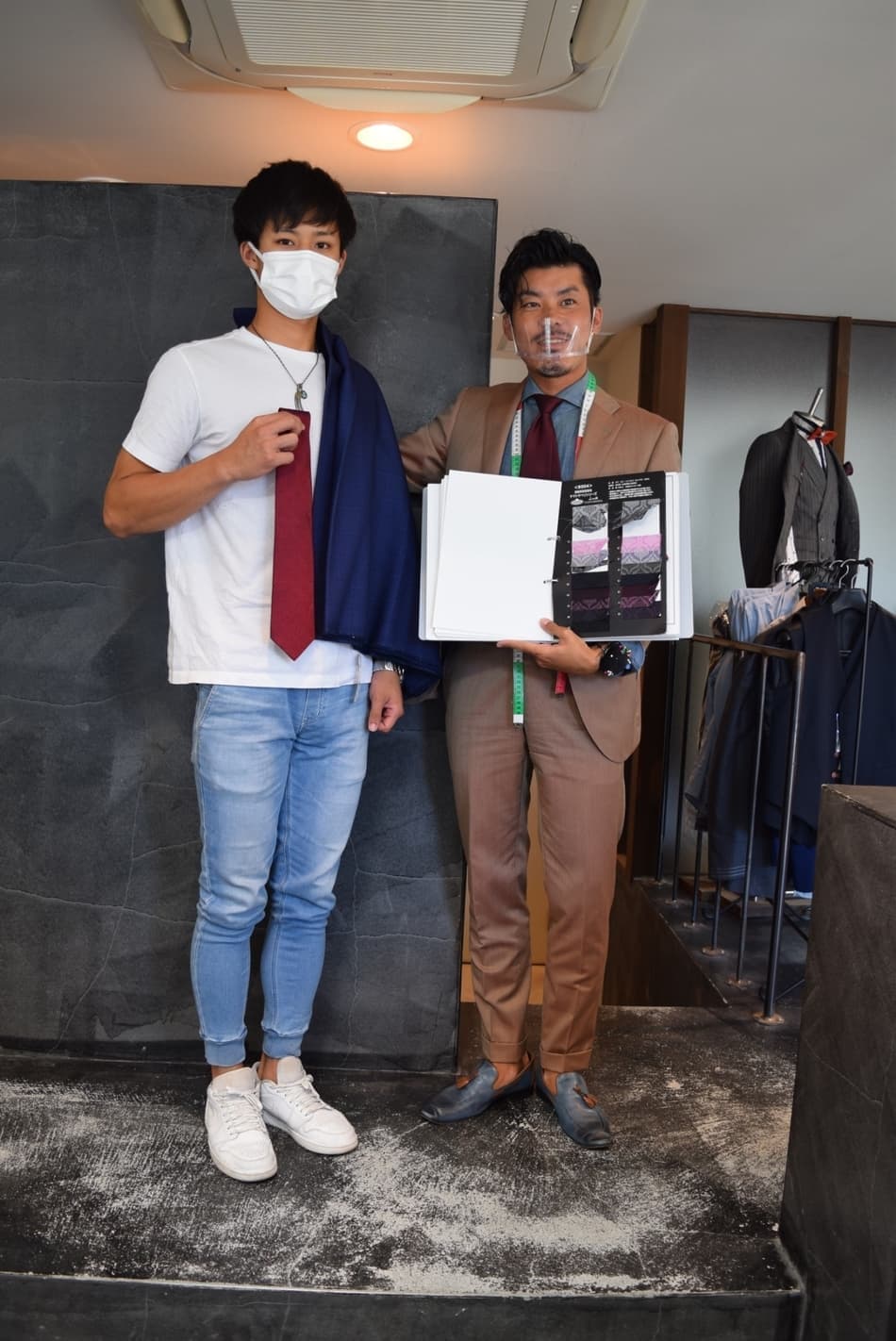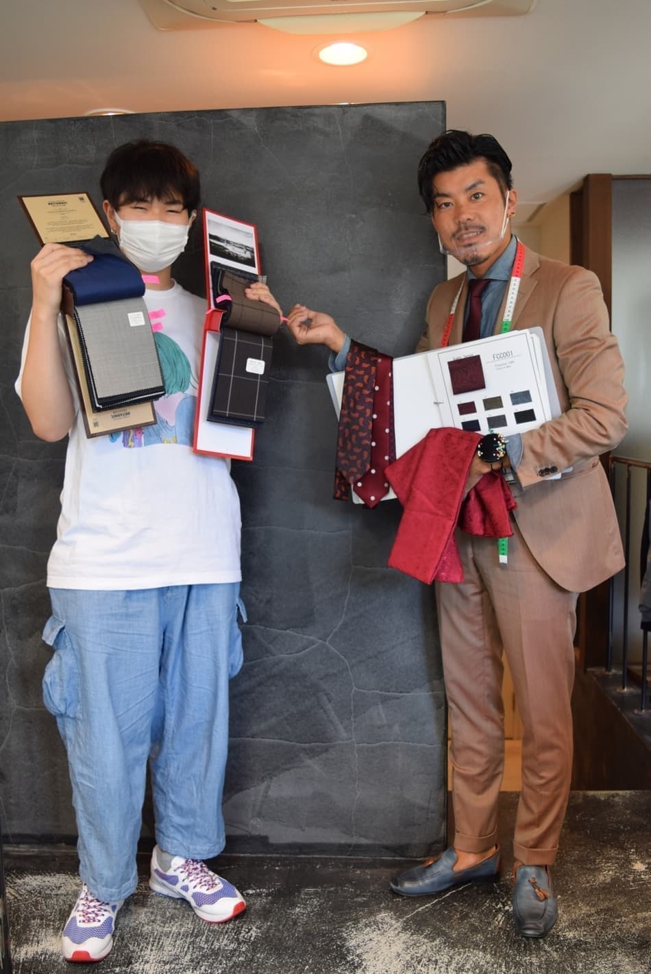 スタイリストと記念写真です。オーダースーツならではの、遊びとしての「裏地」をチョイス。ジャケットを脱いだ時の「チラ見せ」をイメージしながら赤備えスーツの完成を待ちます。