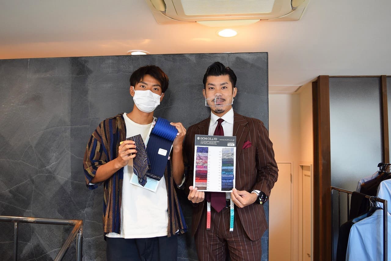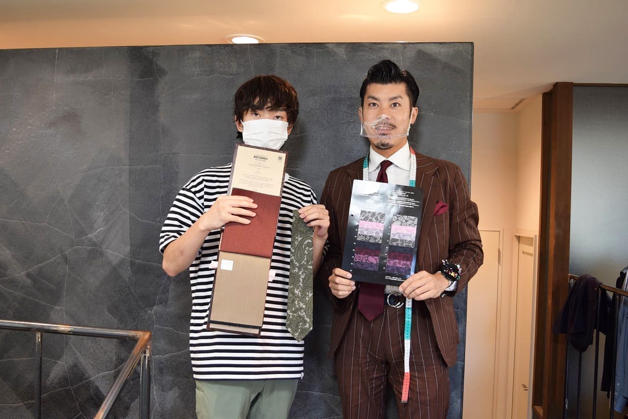 スタイリストと記念写真です。オーダースーツならではの、遊びとしての「裏地」をチョイス。ジャケットを脱いだ時の「チラ見せ」をイメージしながら赤備えスーツの完成を待ちます。