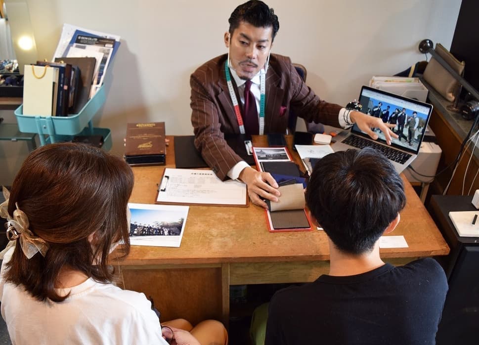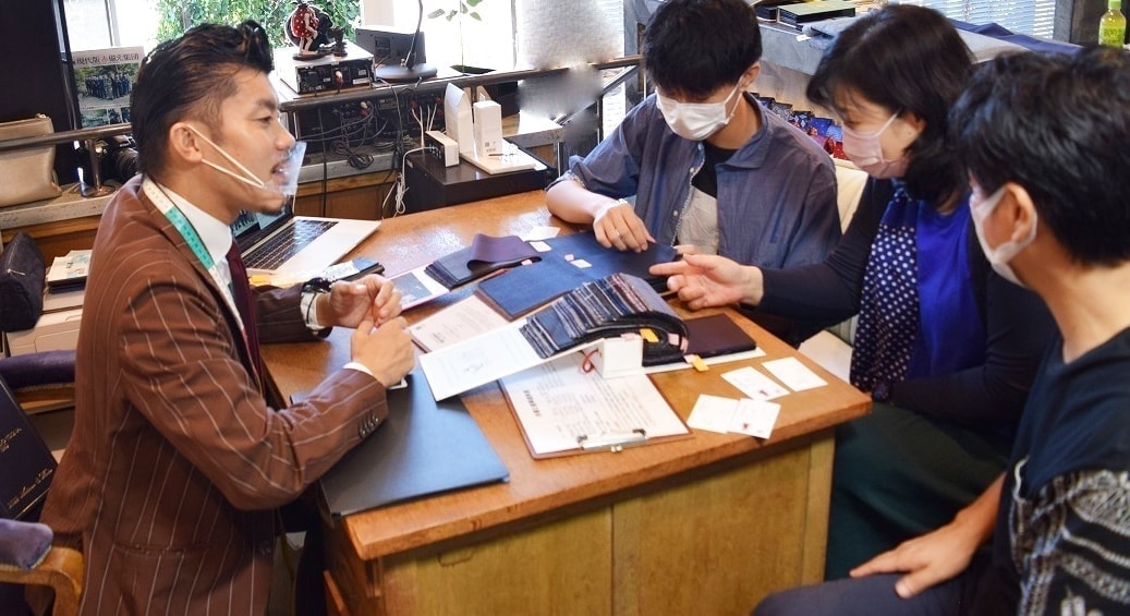 1000種類もある生地から事前に一人一人に合う生地を絞りこみ、今回の元服式の主役である20歳の若者に、一番似合う、色やデザインを提案します。