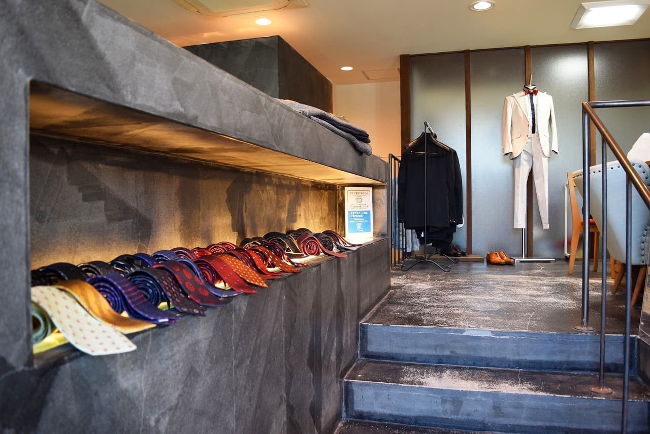 オーダースーツの生地や、カラフルなスーツ裏地のデザイン、スタイリストが特別にピックアップしたオーダーネクタイがディスプレイされています。