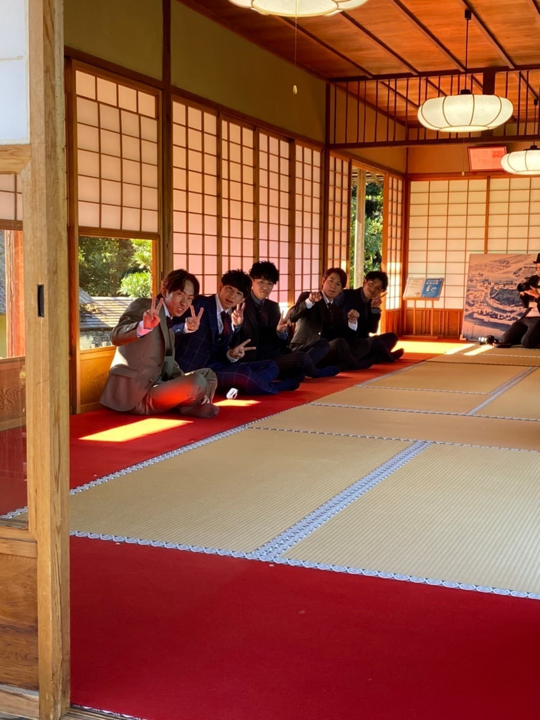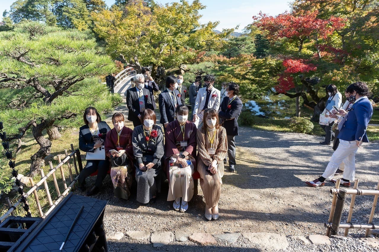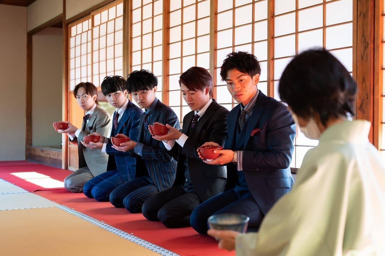 元服式を終えて、大人になった彼ら5人は、玄宮園にある茶室「鳳翔台」にて5名揃って茶道を体験しました。