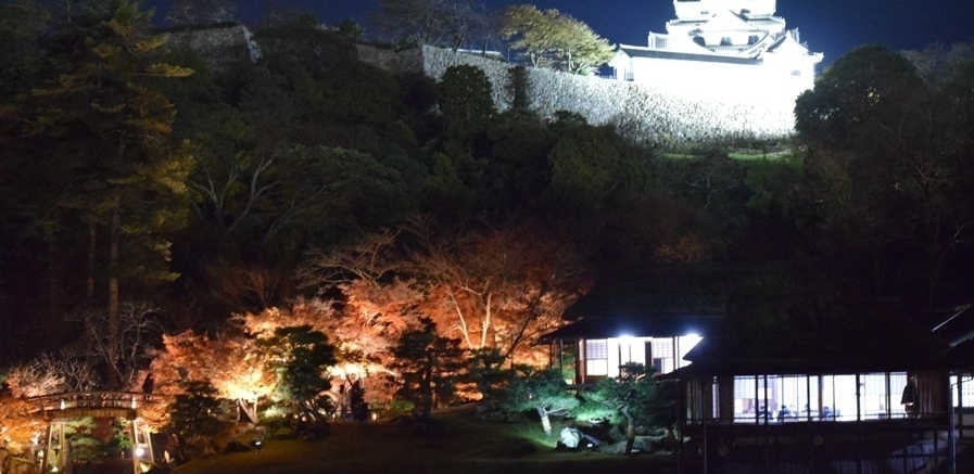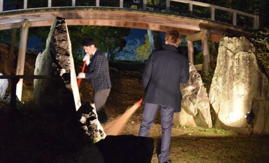 彦根城の前にある国宝玄宮園に赤備えスーツで、紅葉を拾いました。紅葉のライトアップで綺麗な景観を見ながらの清掃でした。