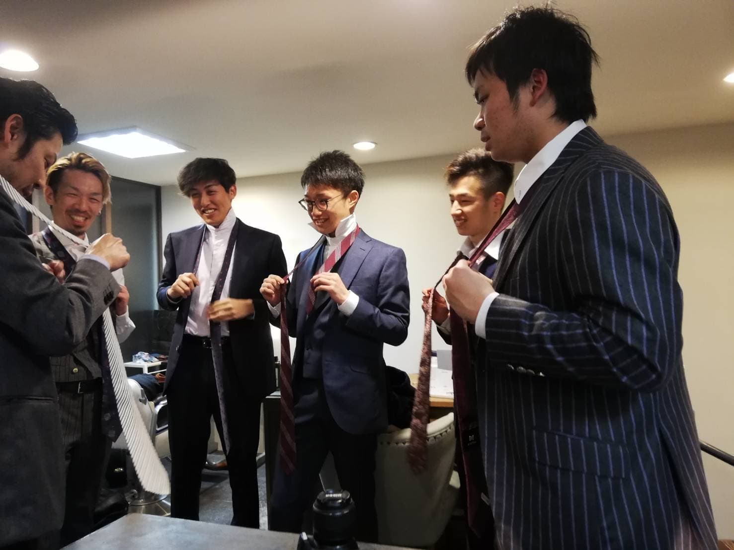 成人メンバーと赤備えメンバーが、スーツを着る時に一番大事な「ネクタイの結び方」を学びました。