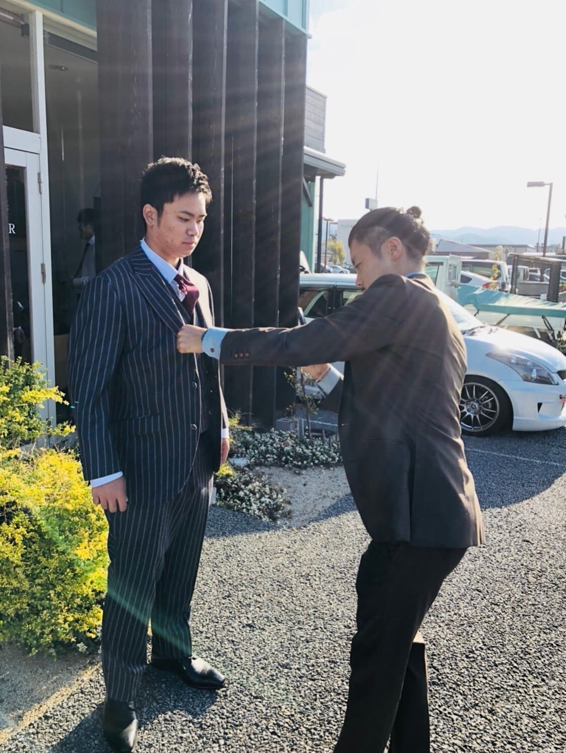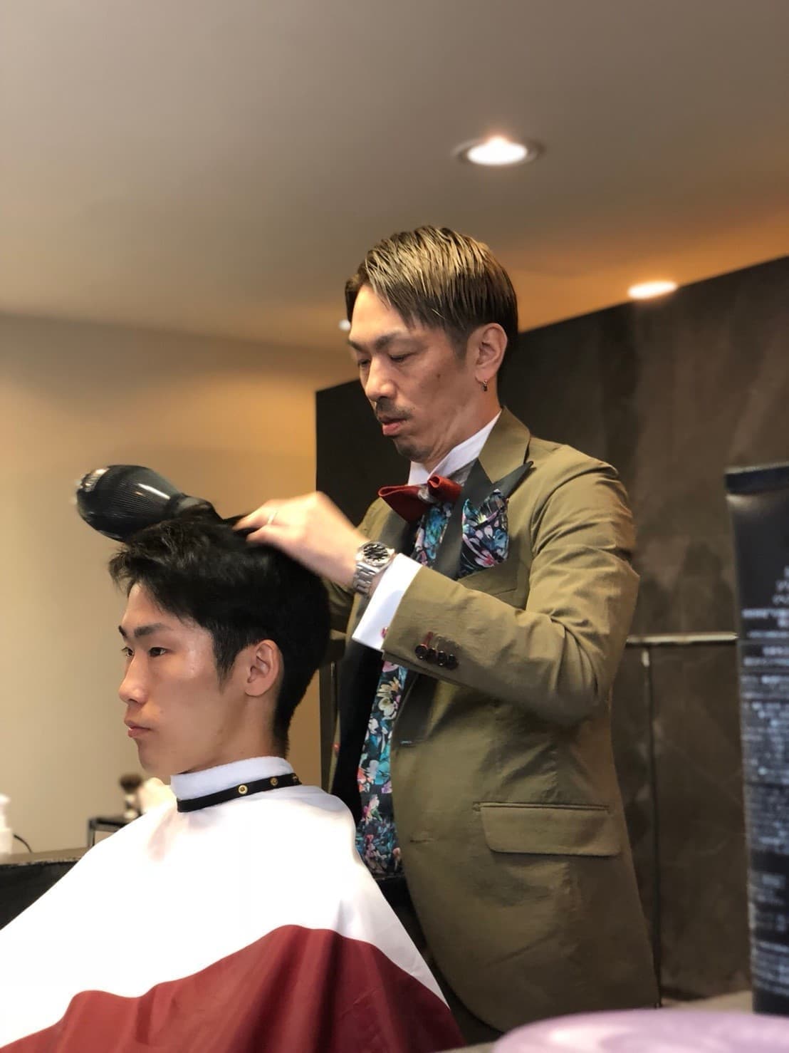 ヘアのスタイリングと 赤備えスーツを身にまといます。