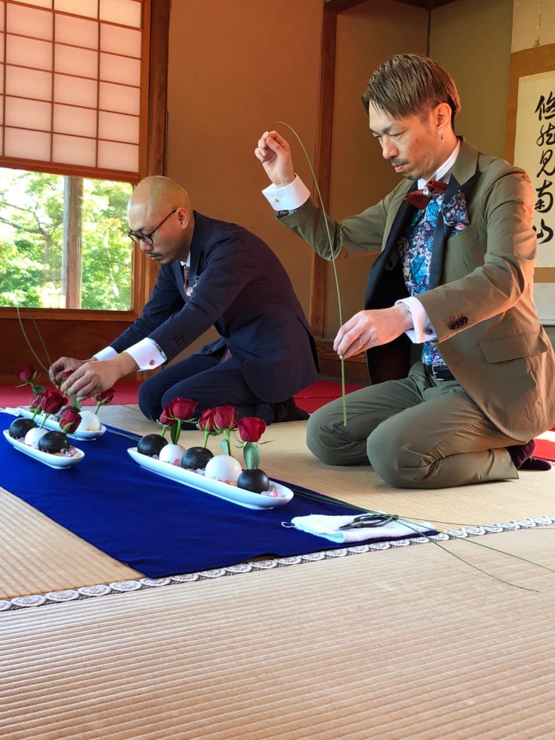ただ花器に挿すのではなく、 普段の内面磨きとして学んでいる華道の「披露の場」としての作品です。そして、華道という日本の伝統芸術の良さ、魅力を少しでも赤備え集団から伝えていければとの思いが詰まっています。