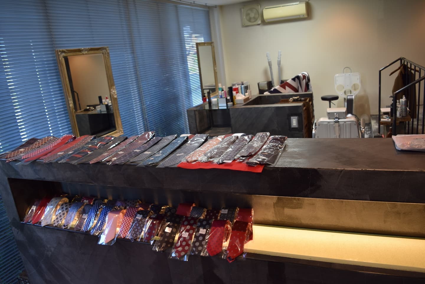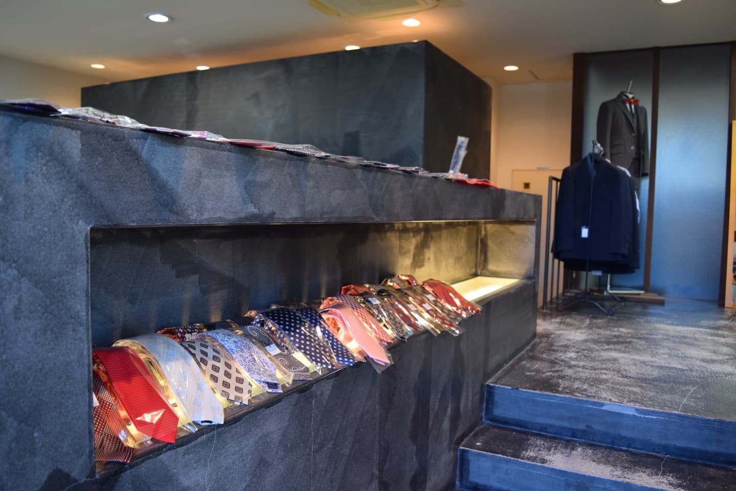オーダースーツの生地や、カラフルなスーツ裏地のデザイン、スタイリストが特別にピックアップしたオーダーネクタイがディスプレイされています。