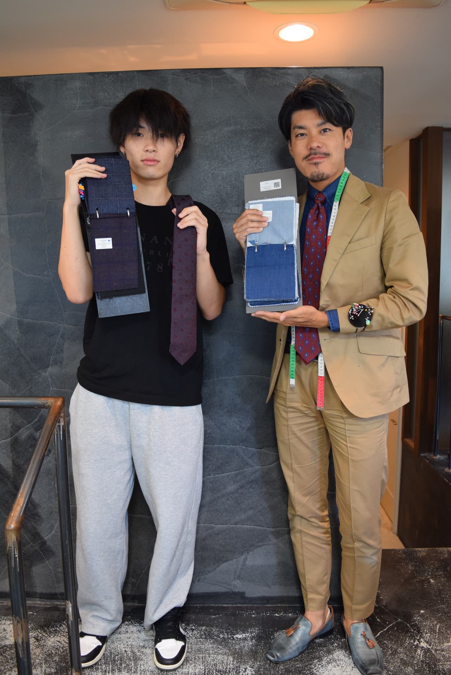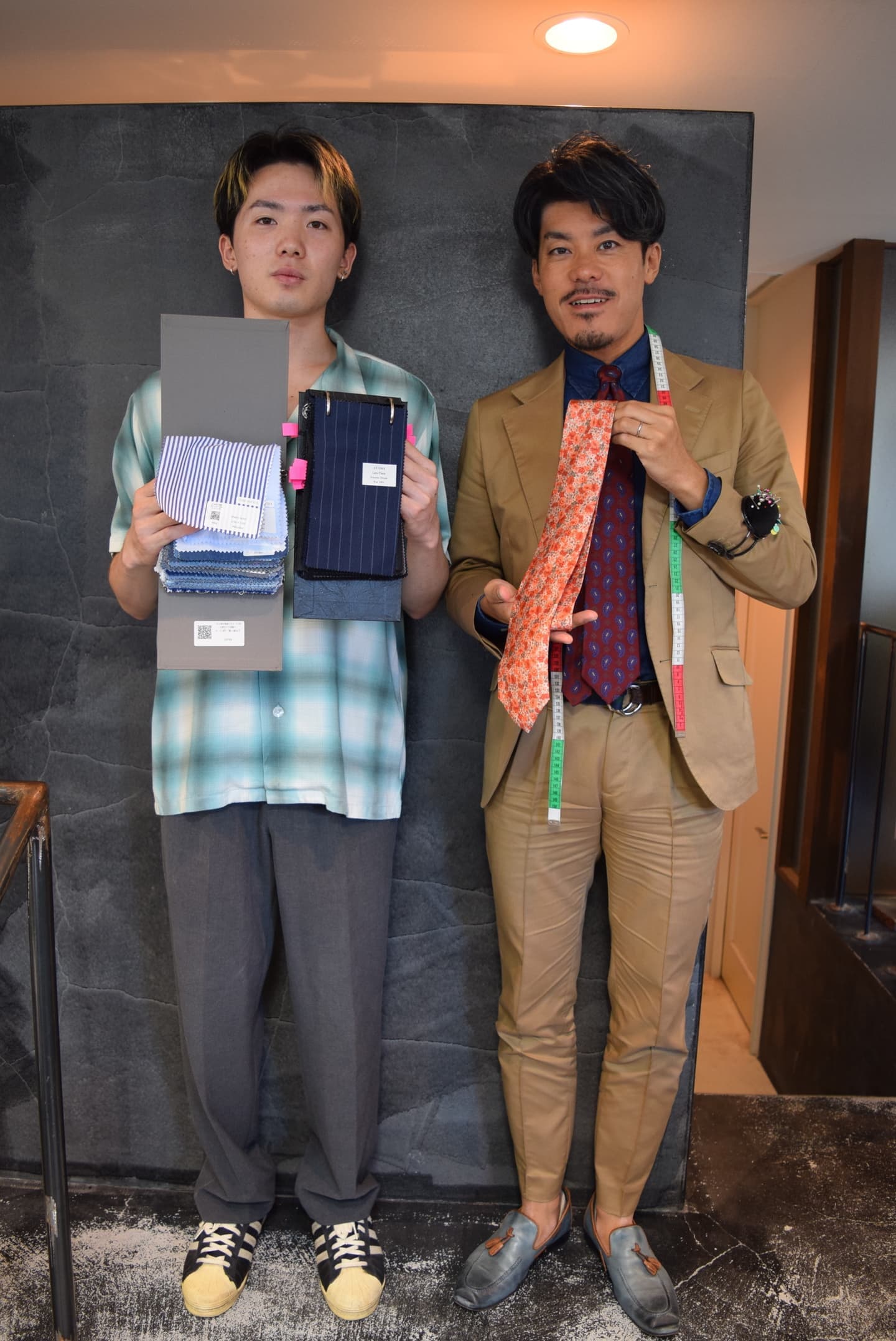 スタイリストと記念写真です。オーダースーツならではの、遊びとしての「裏地」をチョイス。ジャケットを脱いだ時の「チラ見せ」をイメージしながら赤備えスーツの完成を待ちます。