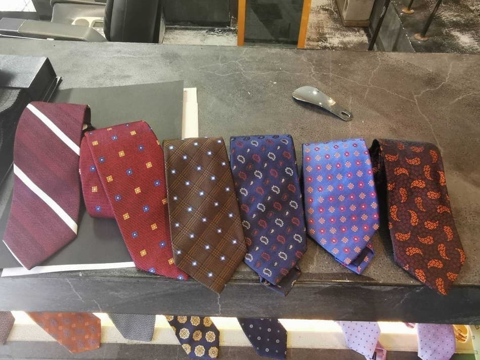 オーダースーツの生地や、カラフルなスーツ裏地のデザイン、スタイリストが特別にピックアップしたオーダーネクタイがディスプレイされています。