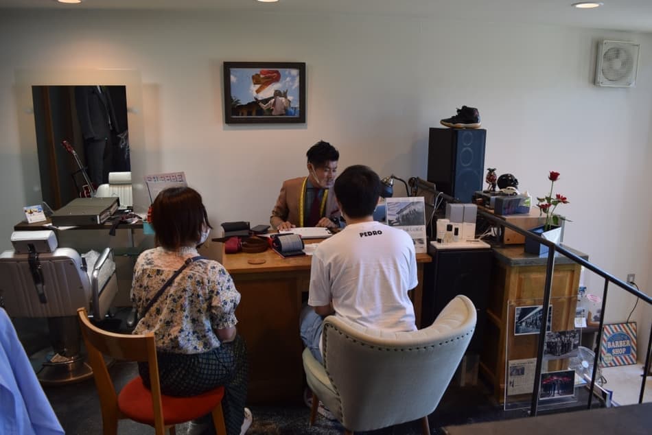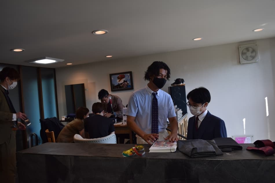 1000種類もある生地から事前に一人一人に合う生地を絞りこみ、今回の元服式の主役である20歳の若者に、一番似合う、色やデザインを提案します。