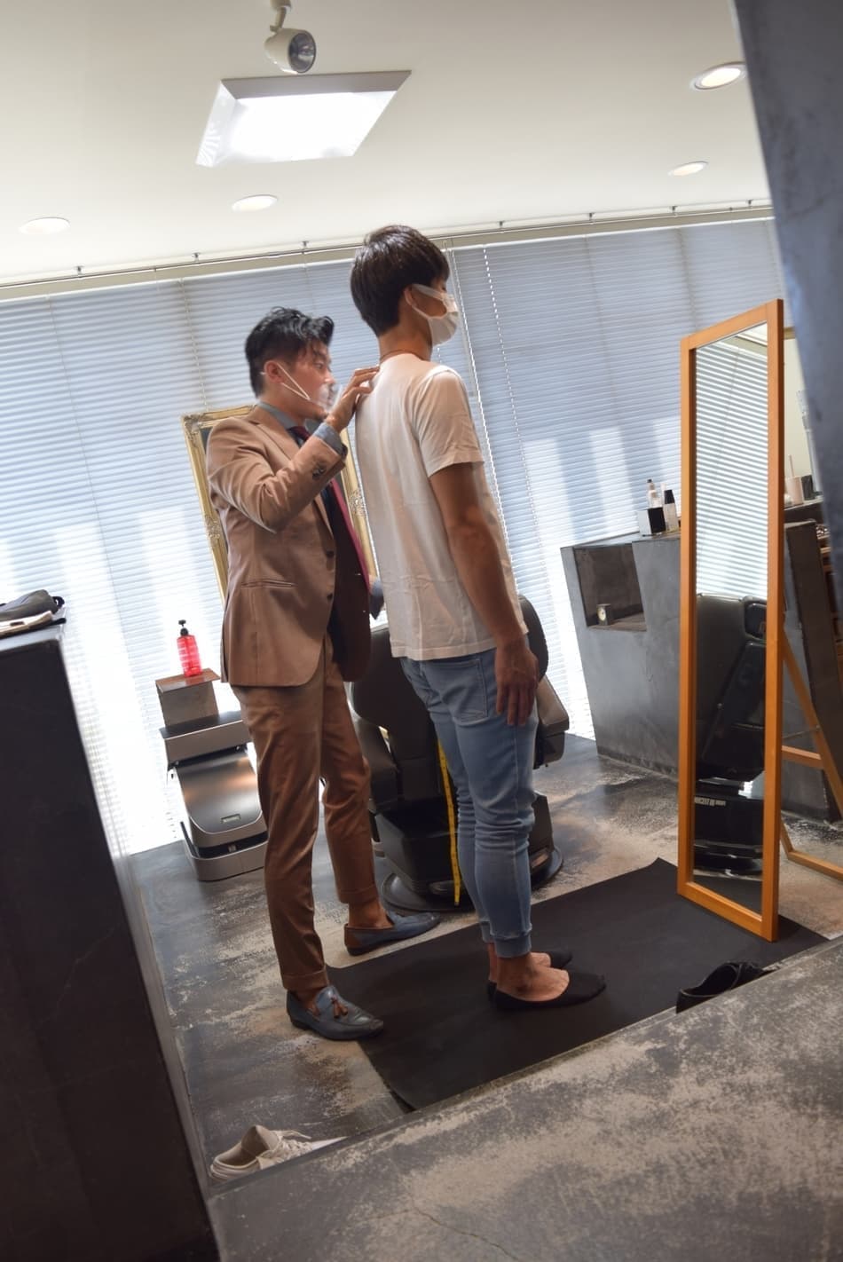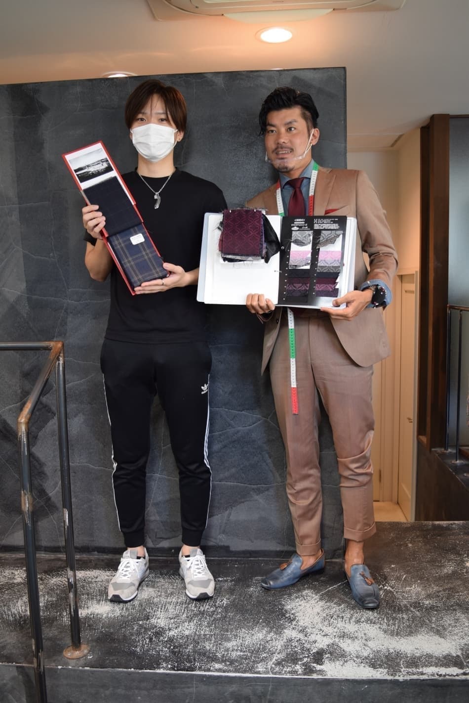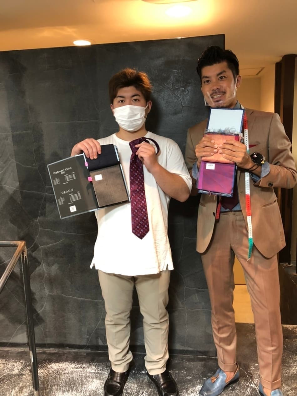 スタイリストと記念写真です。オーダースーツならではの、遊びとしての「裏地」をチョイス。ジャケットを脱いだ時の「チラ見せ」をイメージしながら赤備えスーツの完成を待ちます。
