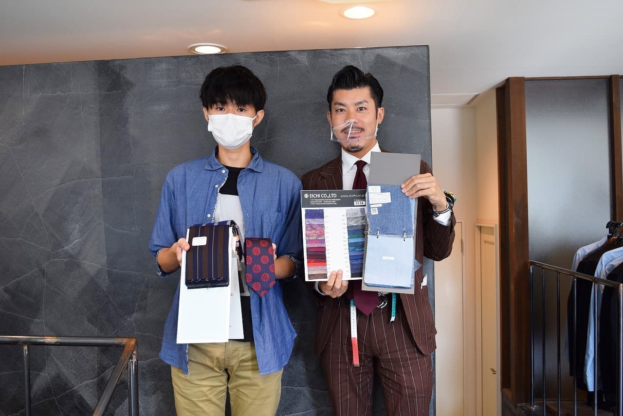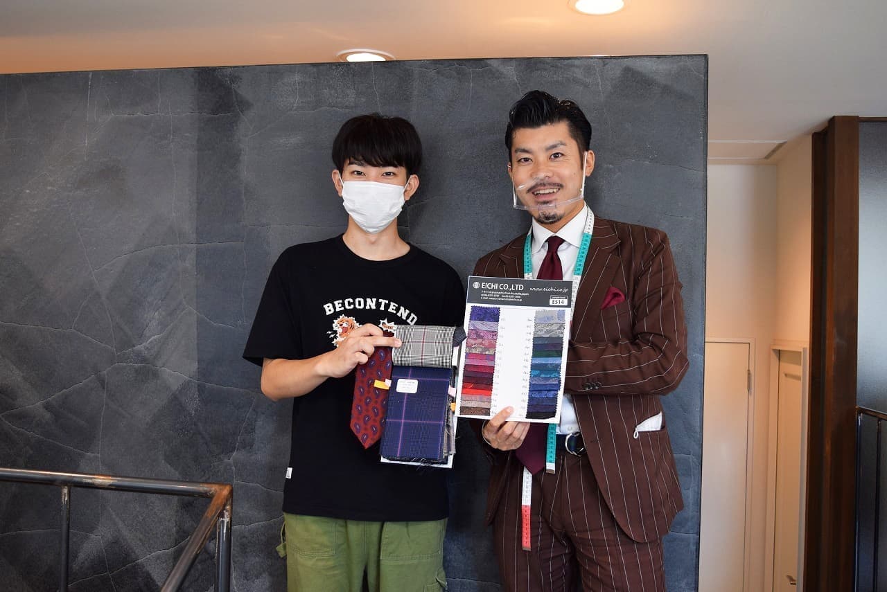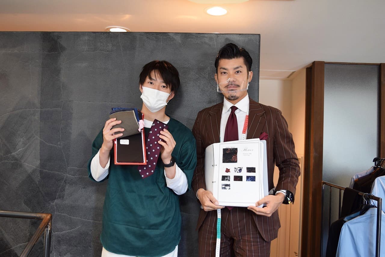 スタイリストと記念写真です。オーダースーツならではの、遊びとしての「裏地」をチョイス。ジャケットを脱いだ時の「チラ見せ」をイメージしながら赤備えスーツの完成を待ちます。