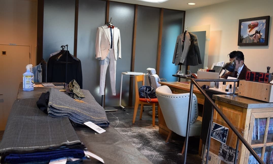 オーダースーツの生地や、カラフルなスーツ裏地のデザイン、スタイリストが特別にピックアップしたオーダーネクタイがディスプレイされています。