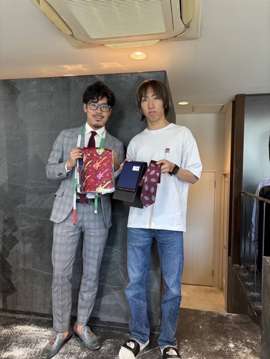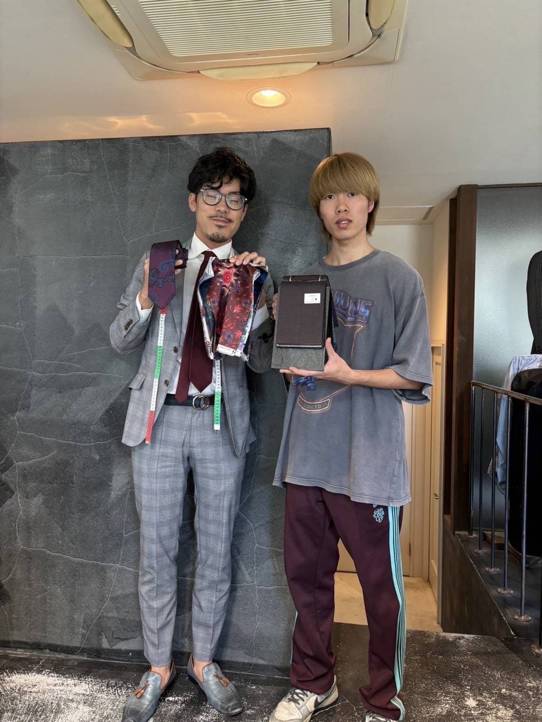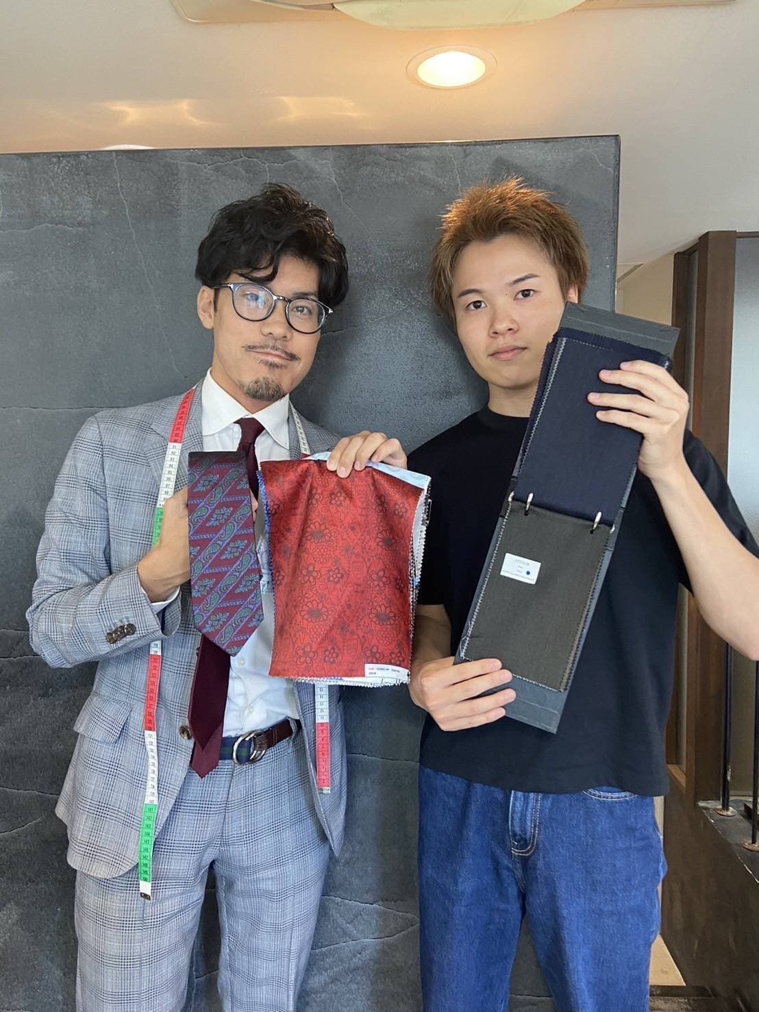 スタイリストと記念写真です。オーダースーツならではの、遊びとしての「裏地」をチョイス。ジャケットを脱いだ時の「チラ見せ」をイメージしながら赤備えスーツの完成を待ちます。