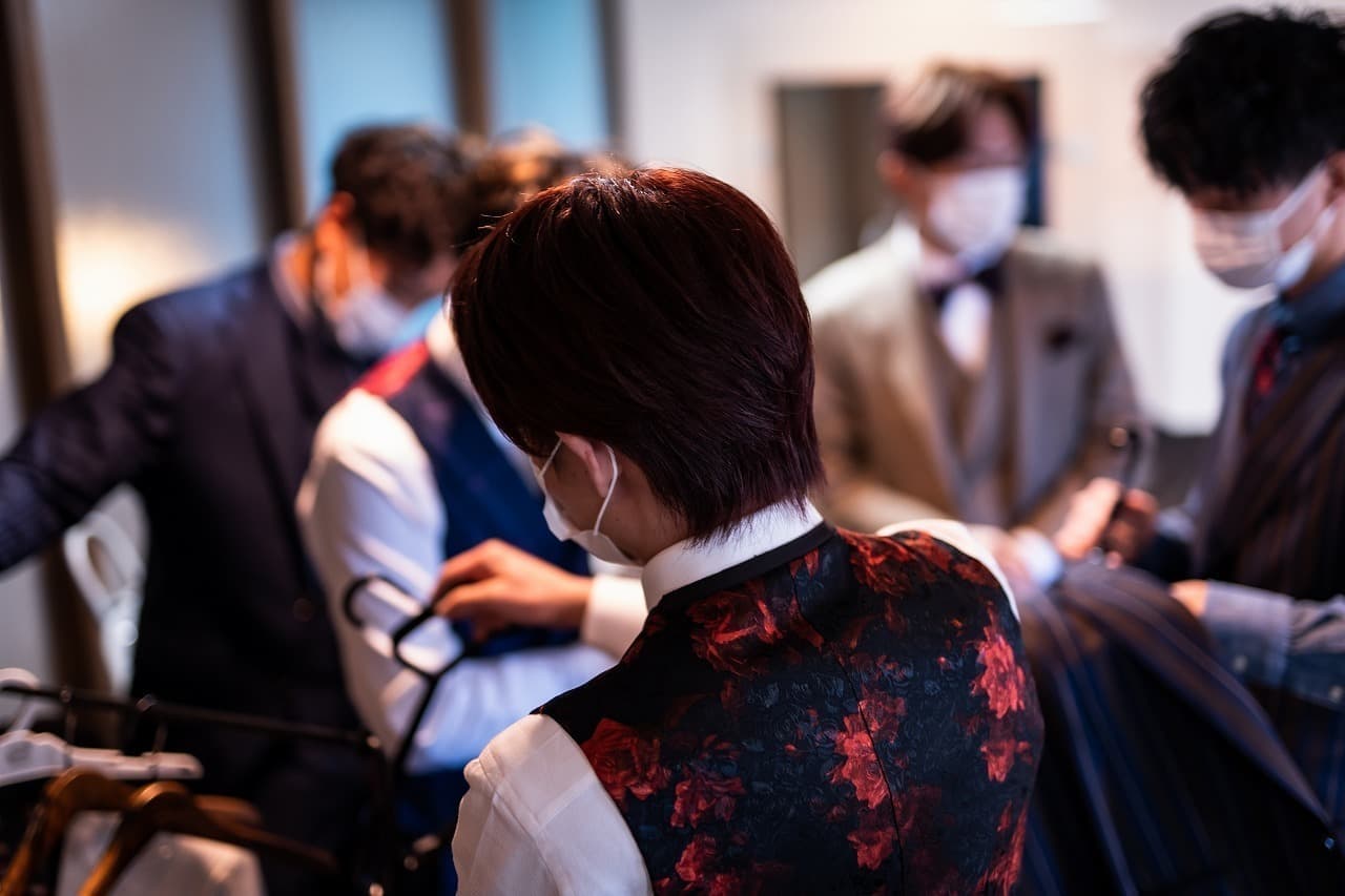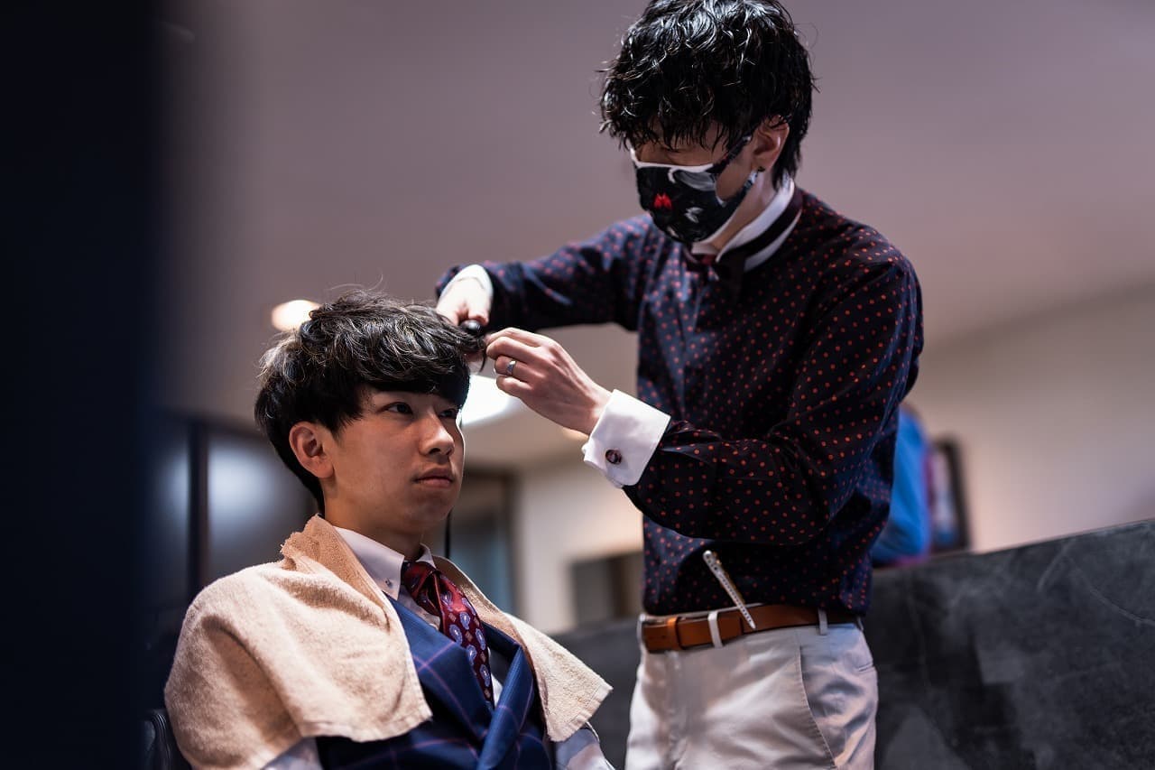 9月オーダースーツの受注会で作成したスーツに袖を通し、赤備えヘアスタイリストがヘアスタイリング。