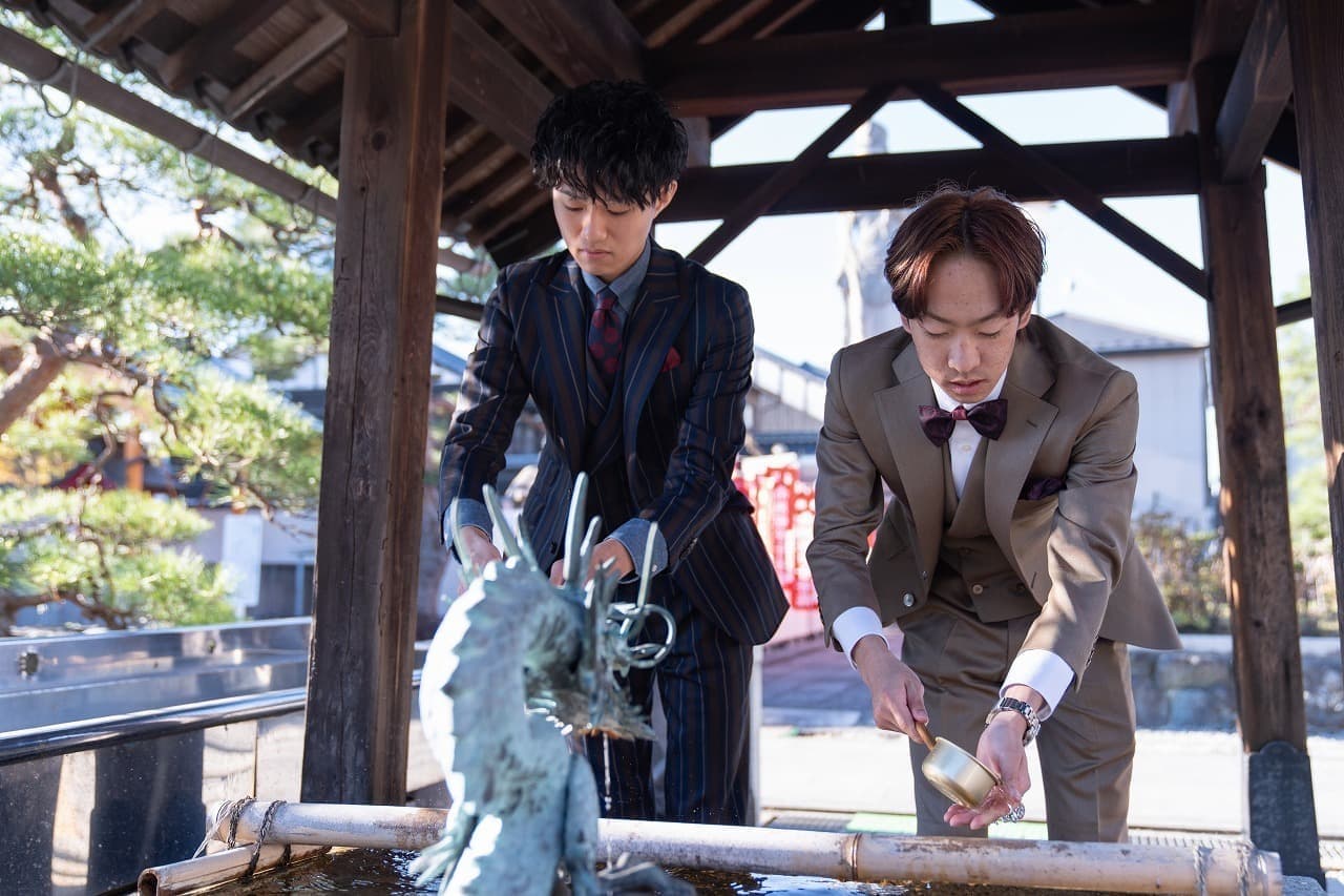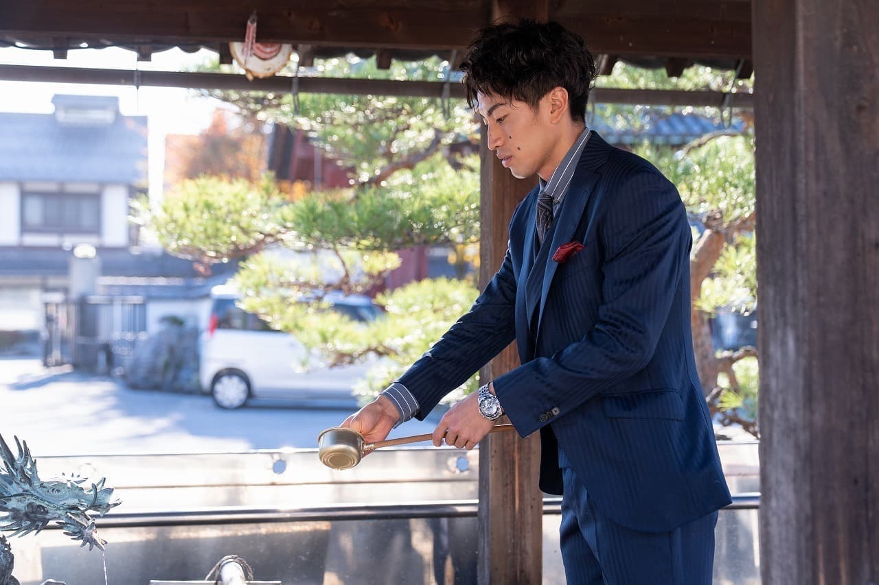 元服式の儀式前に手を浄める(手水)の作法を受けます。