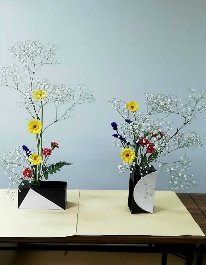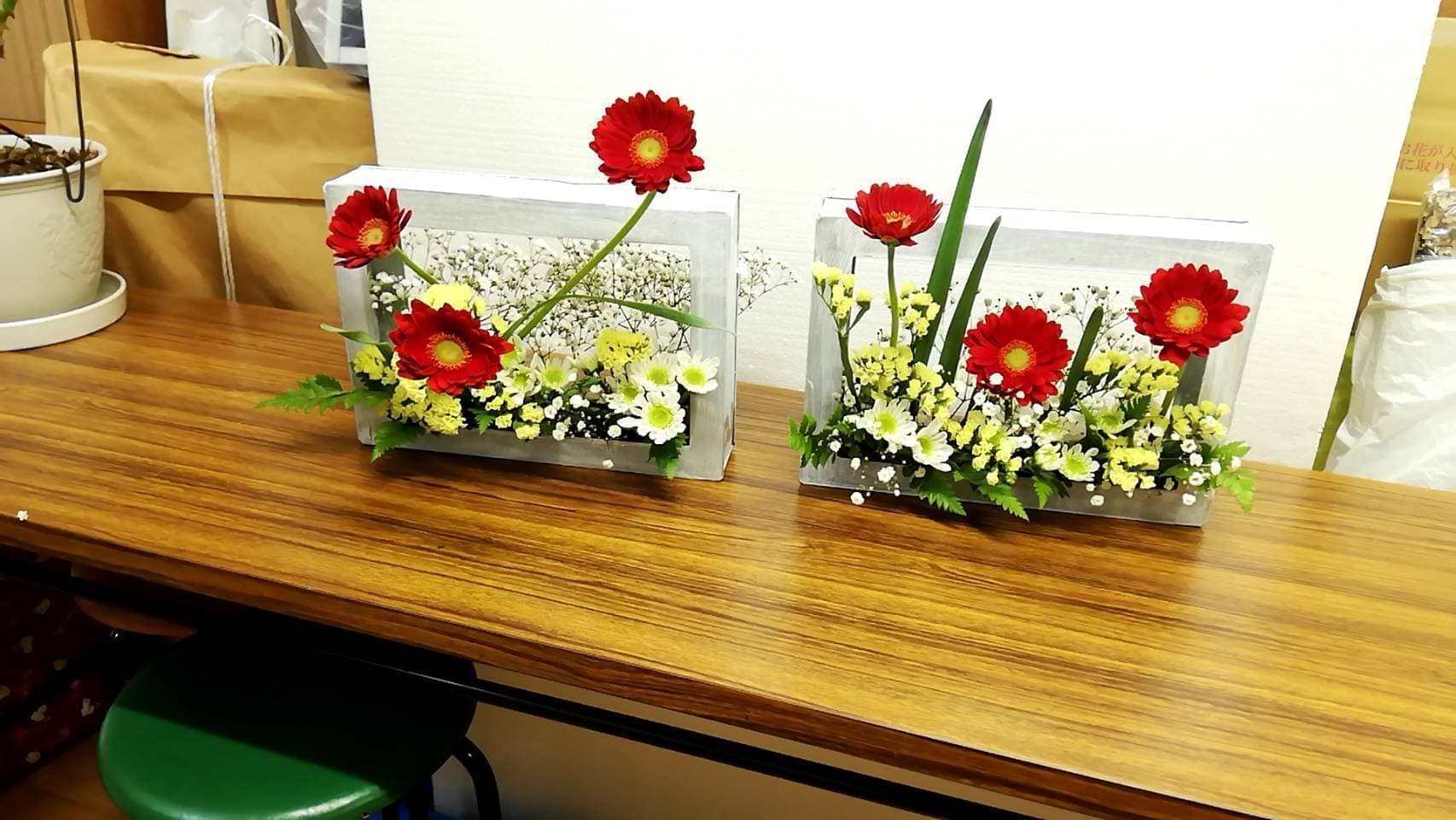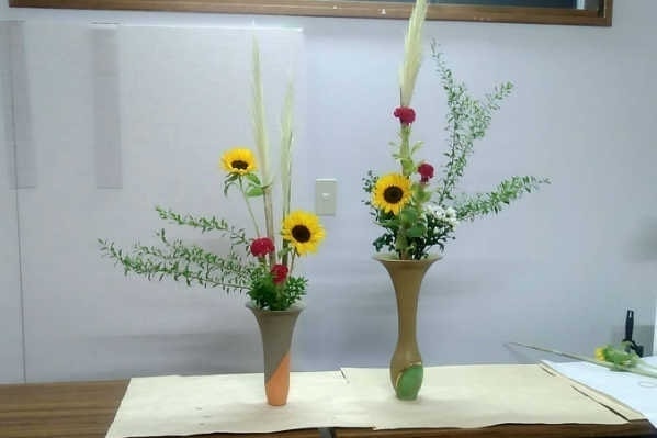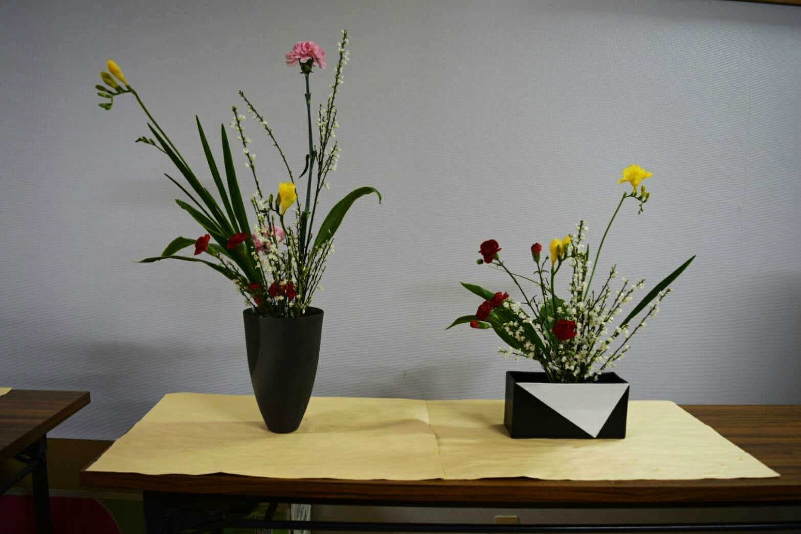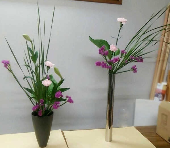 お花の花器を変えて違った生け方を学びました。同じ花材でも、器が変わるとこんなにオメージが変わりました。