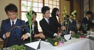 参加者は、早朝から市内の理容室で髪形を整え、出来上がったばかりのスーツを着用。同神社で玉串を奉納した後、指導を受けながら一本一本丁寧に花を生けた。彦根城玄宮園では、茶道も体験した。