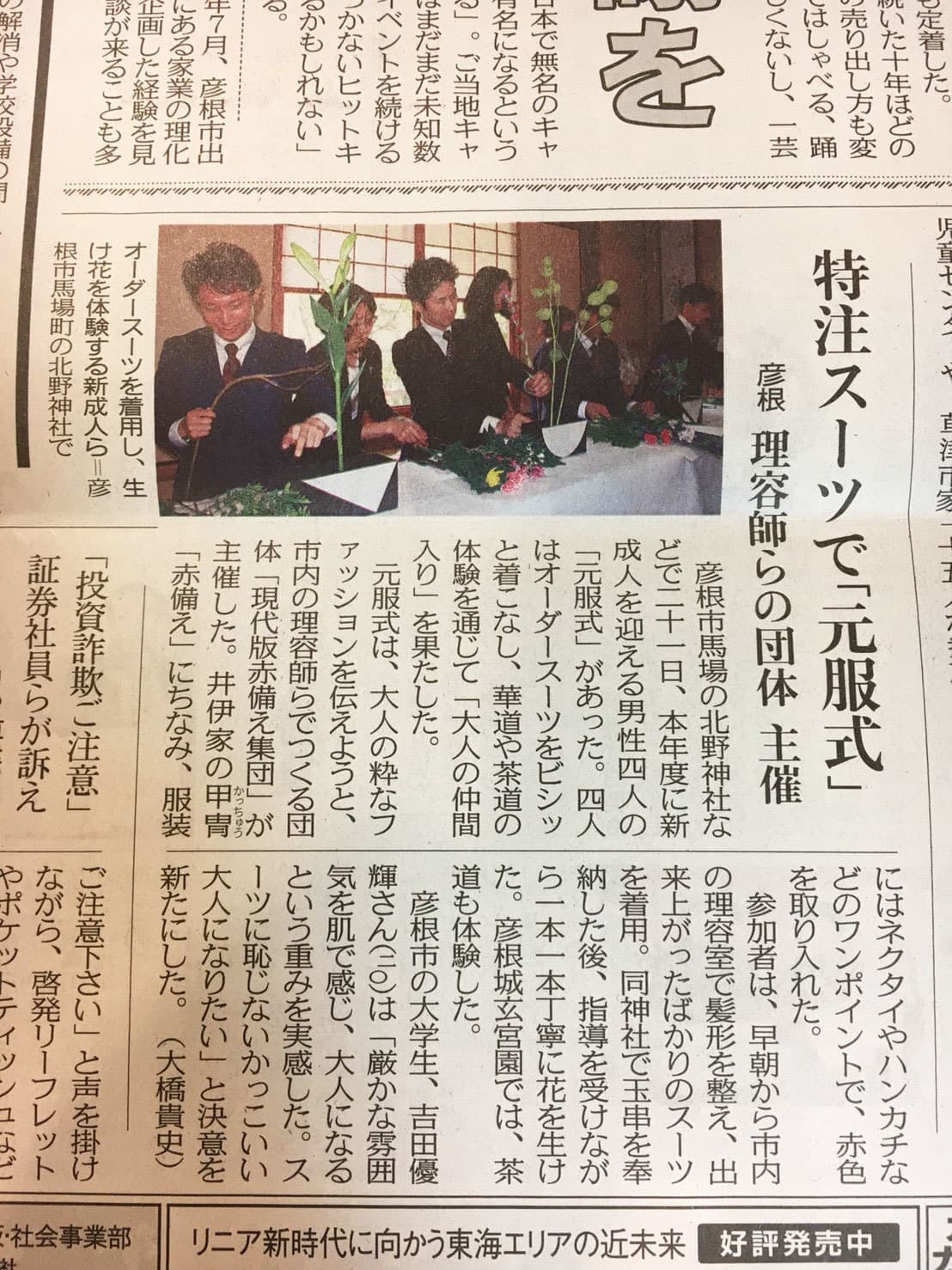特注スーツで「元服式」 彦根理容師らの団体